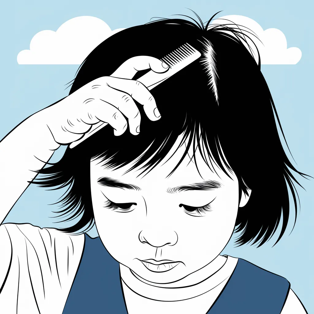 Gambar karakter merapikan poni dengan jari, ekspresi mata sedikit memanjang, menunjukkan rasa percaya diri.