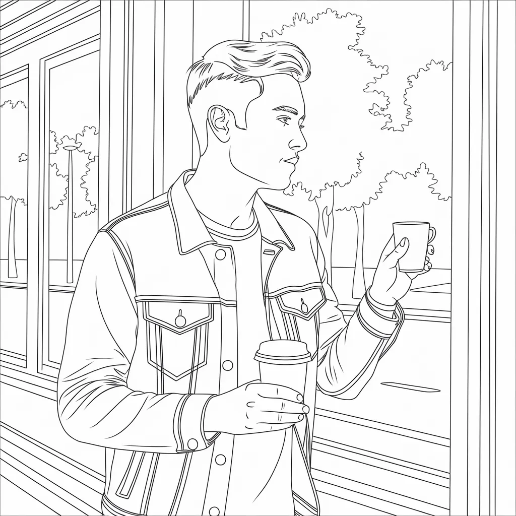 Ilustrasi pria berjaket denim, berdiri di depan jendela kafe, tangan memegang cangkir kopi, menatap keluar dengan tenang.