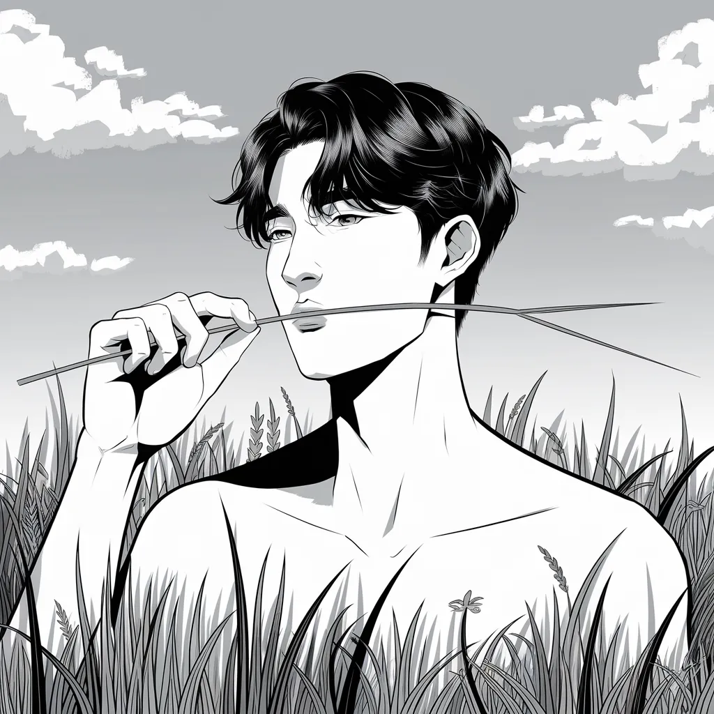 Ilustrasi cowok di padang rumput, menggigit tangkai rumput di mulut, mata memandang cakrawala dengan santai.