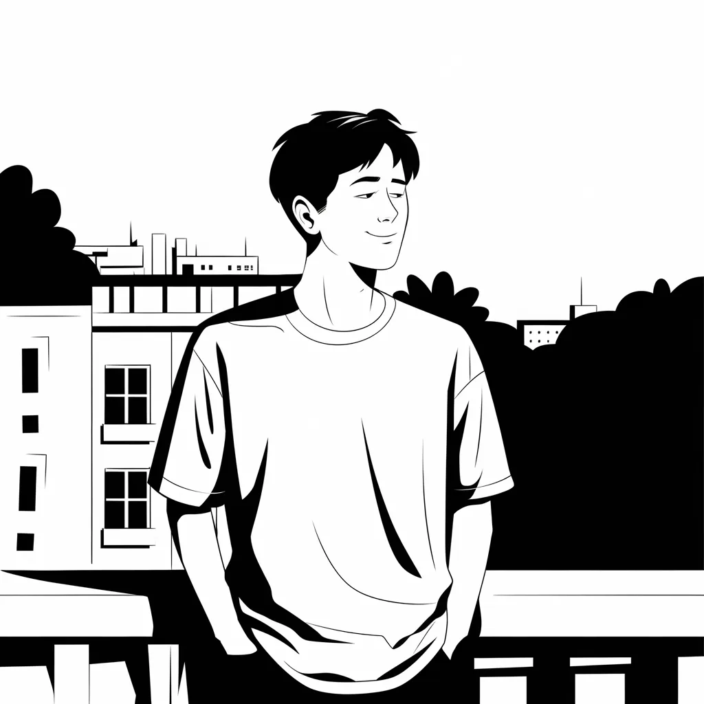 Ilustrasi pria berkaus polos, berdiri di balkon dengan tangan di saku, menatap langit senja dengan ekspresi damai.