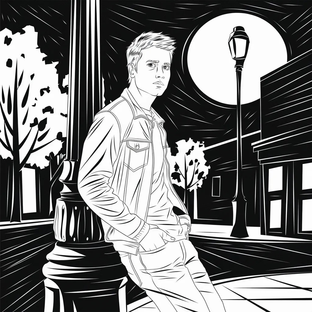 Gambar laki-laki di malam hari, bersandar pada tiang lampu jalan, tangan di saku, memutar mata menyapu sekitar.