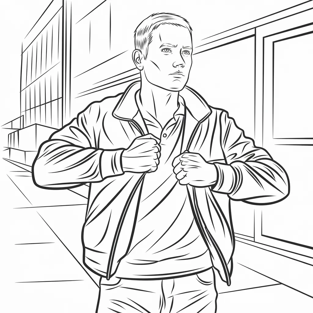 Gambar cowok menarik ujung lengan jaket agar pas, sambil menatap ke depan dengan mengulangi mantap.