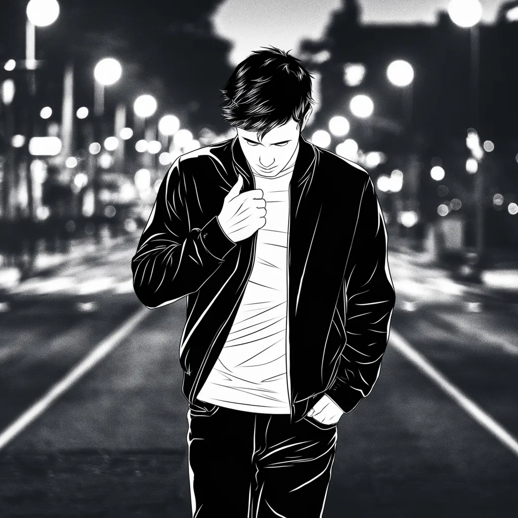 Gambar cowok melangkah di jalanan sepi dengan tangan di jaketnya, lampu-lampu kota jadi latar belakang.