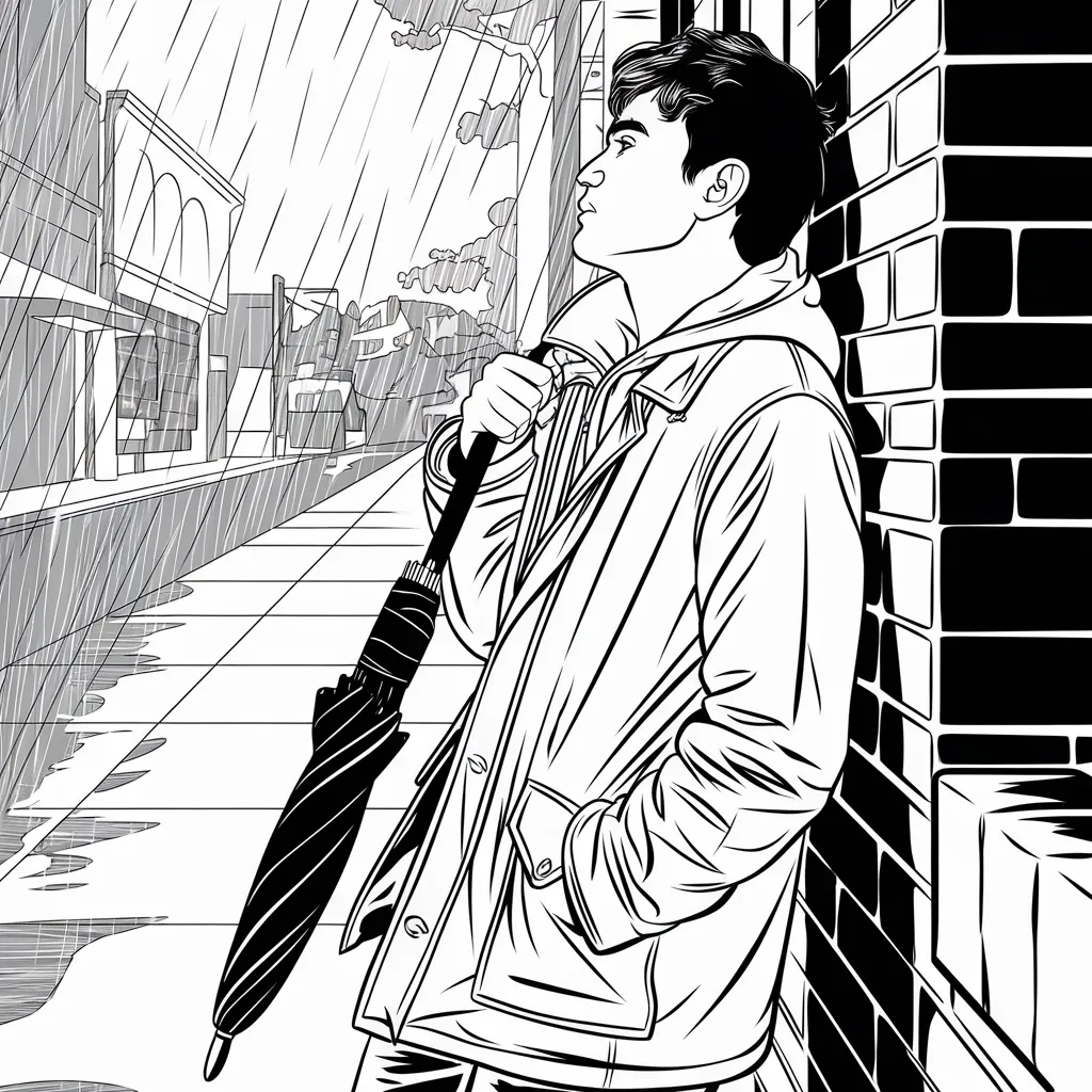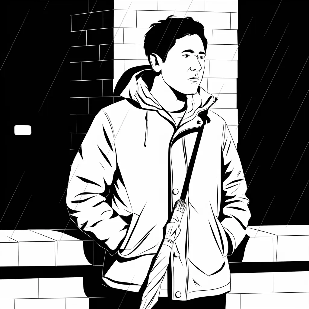 Ilustrasi laki-laki mengenakan jaket parka, membawa payung tertutup sambil bersandar di dinding, menunggu hujan reda.