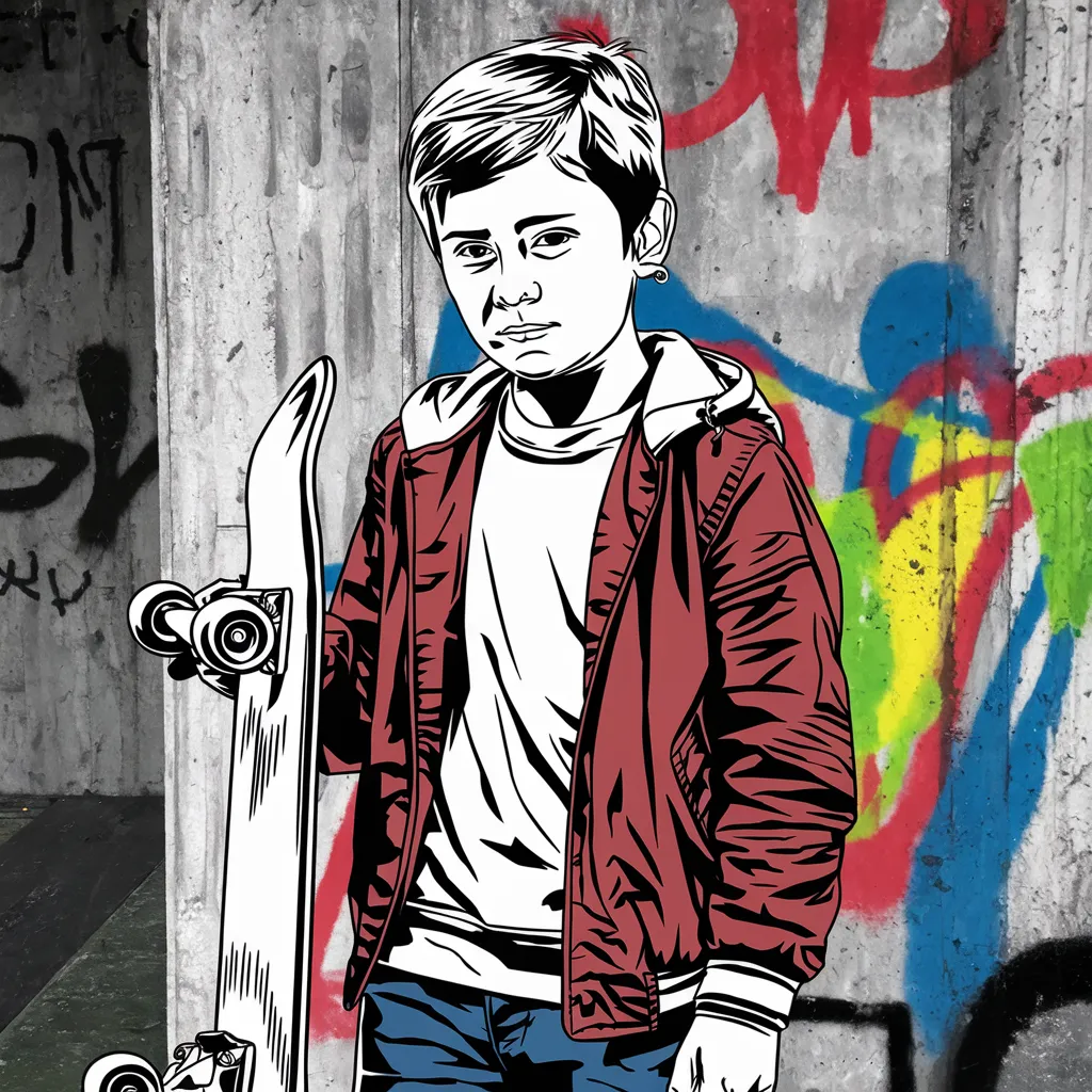 Ilustrasi pria dengan topi baseball dan skateboard di tangan, memberi kesan gaya street style yang santai.