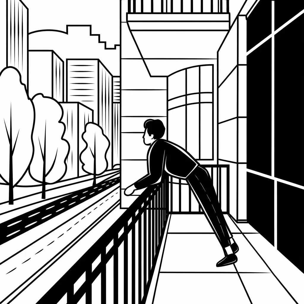 Ilustrasi cowok dengan rambut sedikit berantakan, bersandar di pagar balkon tinggi, melihat mata jauh ke depan.