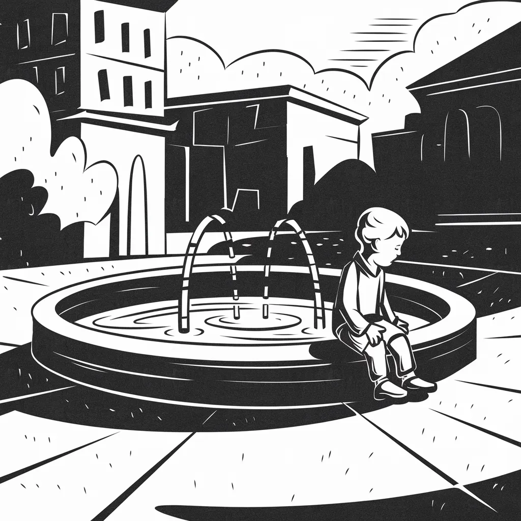 Gambar cowok dengan kemeja polos duduk di tepi kolam atau air mancur, kedua tangan di belakang, kepala sedikit mendongak.