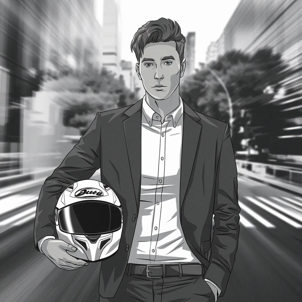 Ilustrasi pria dengan pakaian semi-kasual, memegang helm di satu tangan, seolah-olah habis mengendarai motor sport.