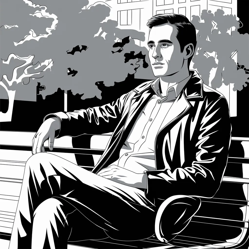 Ilustrasi pria berjaket kulit, duduk santai di bangku taman sambil melipat kaki, menunjukkan ketenangan diri.