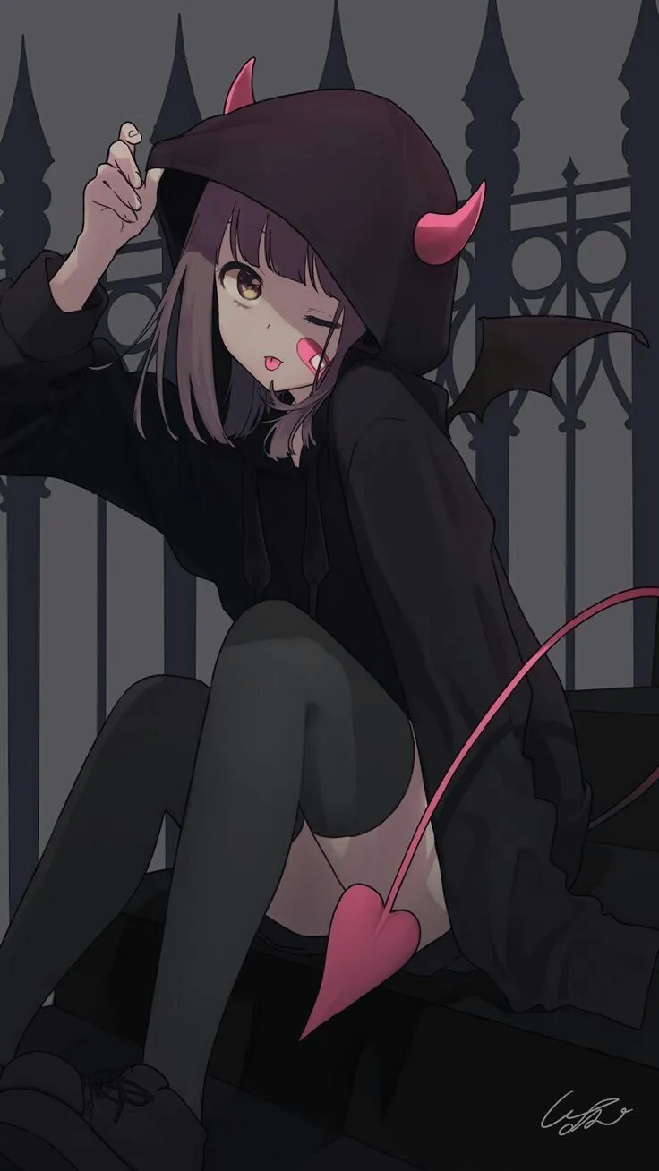 Kesan tampilan gambar anime perempuan tersebut adalah lucu dan menggemaskan. Dengan pose menjulurkan lidah, ekspresi wajah yang ceria dan kostum yang imut dengan hiasan tanduk dan sayap kecil memberikan kesan playful dan fun. Jaket hodie warna hitam memberikan kontras yang menarik dengan hiasan pink di kepala dan aksen warna lainnya pada kostum. Overall, gambar tersebut menggambarkan karakter anime yang ceria dan lucu dengan kostum yang unik dan menarik.
