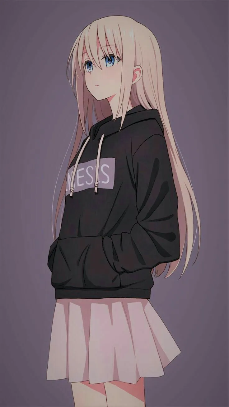 Tampilan gambar anime perempuan dengan rambut panjang pirang yang mengenakan jaket hodie warna hitam dan rok mini warna nude memberikan kesan gabungan antara keanggunan dan keberanian. Rambut pirang yang panjang memberikan kesan feminin dan anggun, sementara jaket hodie hitam dan rok mini warna nude menunjukkan keberanian dan kepercayaan diri.