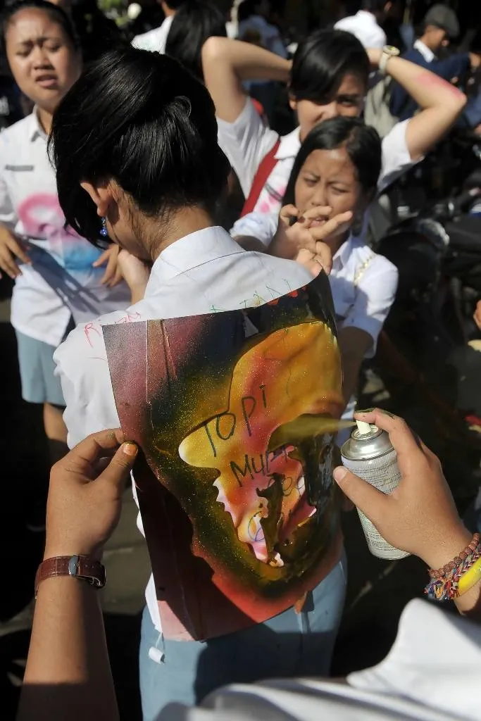 Pada gambar berikutnya ini terdapat sebuah baju kelulusan dengan sebuah motif yg terbuat dengan teknik stencil,yg mana tehnik stencil sendiri merupakan tehnik cetak yg memanfaatkan media semprot di atas pola yang telah ditentukan sebelumnya. Jadi mudah banget sih motif seperti ini kalian gunakan pada baju kelulusan kalian nantinya.