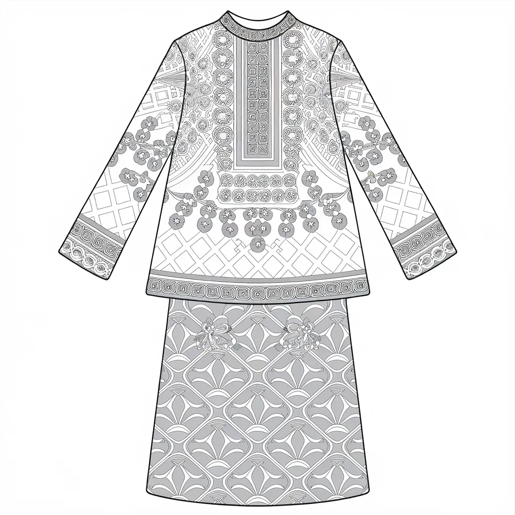 Pakaian khas dengan motif geometris atau floral.
