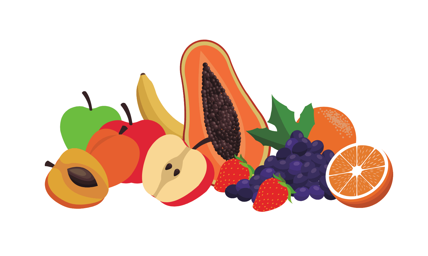 Buah-buahan seperti apel, jeruk, mangga, anggur, stroberi, kiwi, nanas, dan lainnya dapat digambarkan dengan warna yang cerah dan menyala, serta diberi detail seperti kilauan air di permukaannya untuk memberikan kesan kesegaran. Bentuk dan ukuran buah-buahan juga dapat diubah menjadi lebih imut dan menggemaskan dalam gambar kartun.