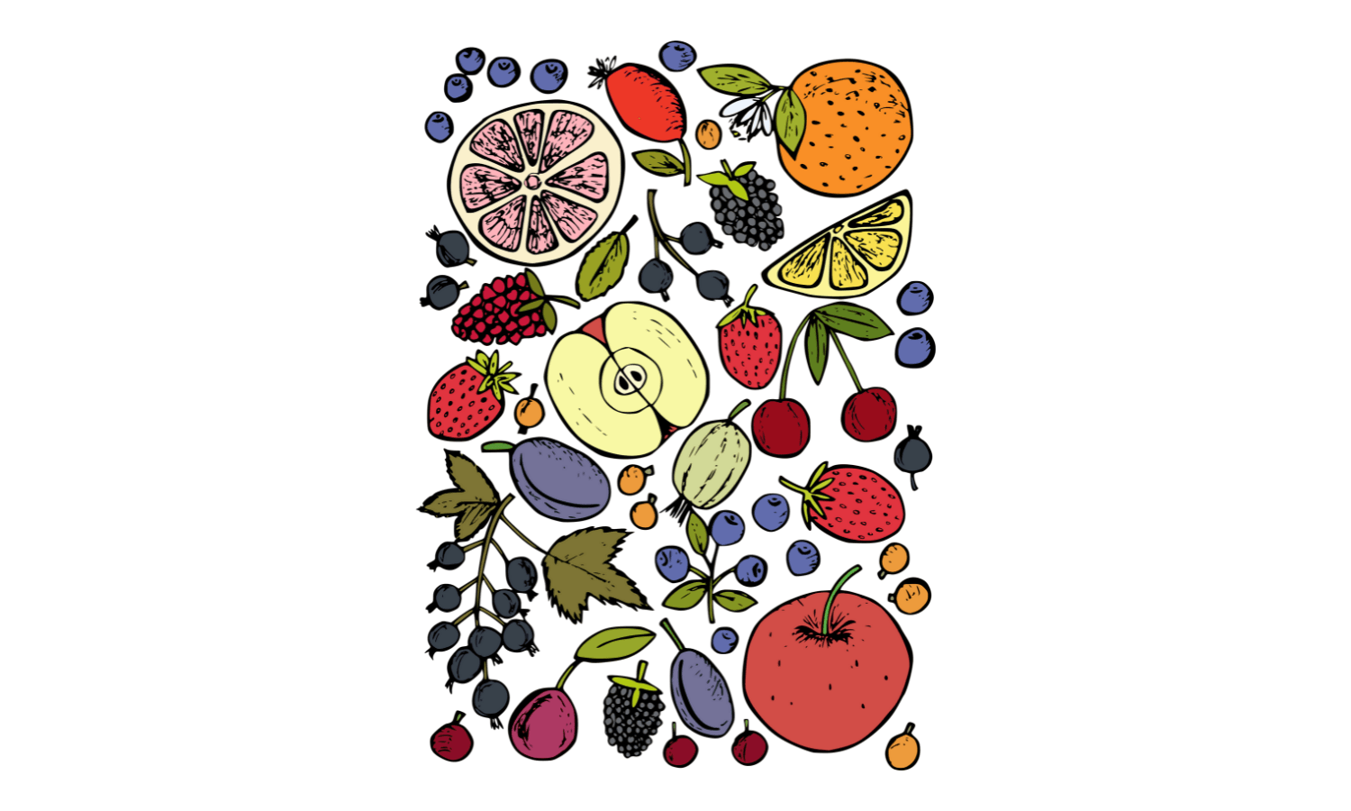 Penggunaan warna yang cerah dan alami pada buah dan sayur-sayuran dapat menambahkan kesan segar dan menyegarkan. Misalnya, buah jeruk dapat digambarkan dengan warna oranye yang cerah dan terang, sedangkan sayur-sayuran hijau seperti brokoli atau selada dapat digambarkan dengan warna hijau yang segar.
