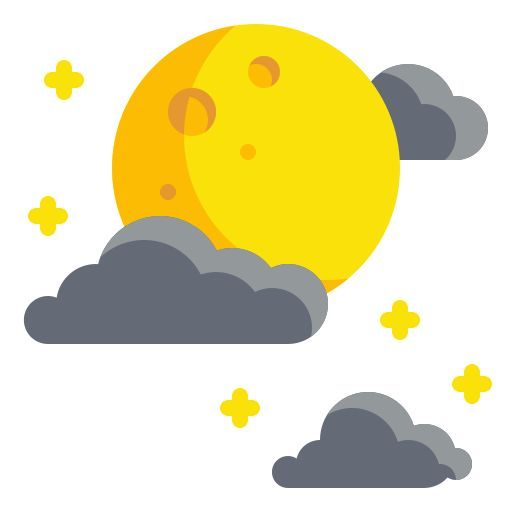 Tampilan gambar tersebut menggambarkan suasana yang misterius dan penuh keajaiban. Bulan kuning cerah memberikan nuansa ajaib, sementara bintang-bintang dan awan-awan hujan gelap menambahkan elemen misteri dan keindahan alam semesta.