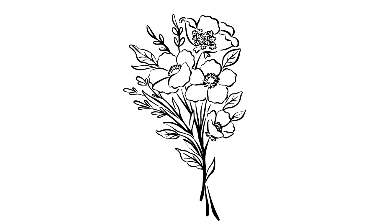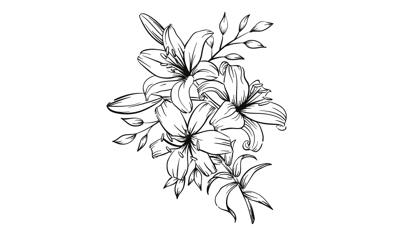 Tampilan gambar sketsa hitam putih buket bunga lily memberikan kesan elegan dan mewah. Garis-garis hitam yang digunakan untuk menggambarkan detail bunga lily memberikan kesan rapi dan terstruktur. Bunga lily yang memiliki bentuk elegan dan simpel ini terlihat cantik dengan bayangan hitam yang diberikan pada gambar sketsa. Kesan minimalis yang diberikan pada gambar sketsa ini juga memberikan kesan keindahan dan keanggunan bunga lily yang lebih terlihat.