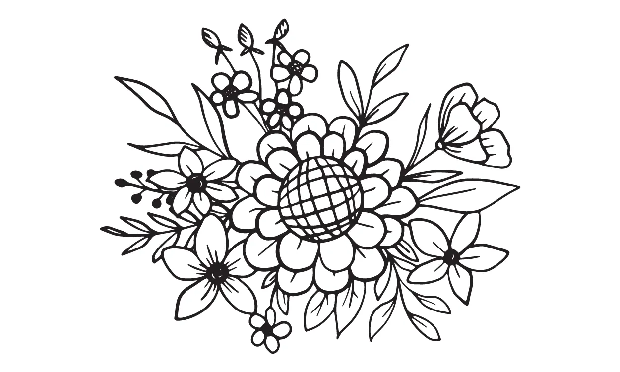 Gambar sketsa karangan beragam bunga seperti tulip, lotus, dan daisy memberikan kesan indah dan menenangkan. Sketsa tersebut mampu menampilkan keindahan dari setiap jenis bunga yang digabungkan, sehingga menciptakan kesan harmoni dan keseimbangan. Tulip memberikan kesan elegan dengan warnanya yang beragam, lotus memberikan kesan keanggunan dan spiritualitas dengan bentuknya yang unik, dan daisy memberikan kesan kesederhanaan dan keceriaan dengan warnanya yang cerah. Dalam keseluruhan gambar, karangan bunga ini dapat memberikan kesan keindahan dan kedamaian yang dapat memperindah suasana.
