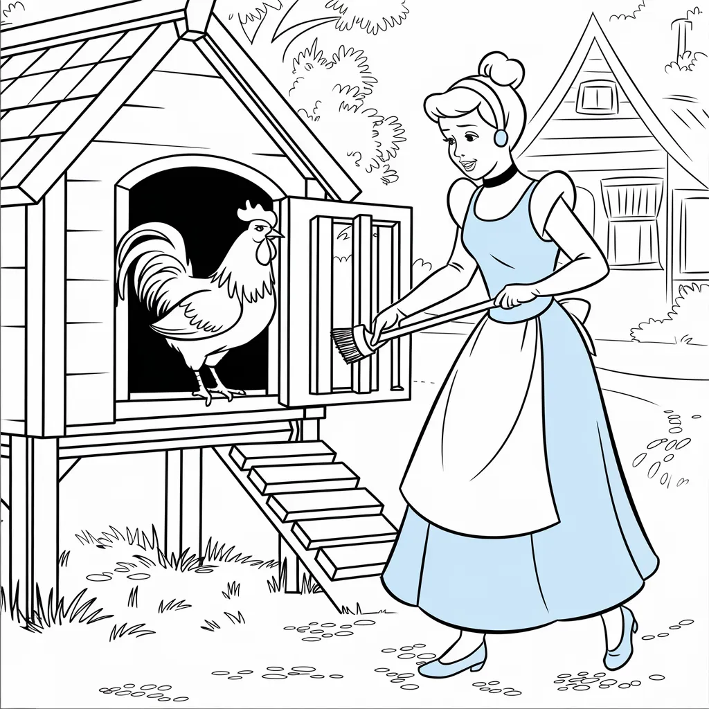 Ilustrasi Cinderella yang memberi makan ayam jago di pagi hari, menambah elemen kehidupan pedesaan.