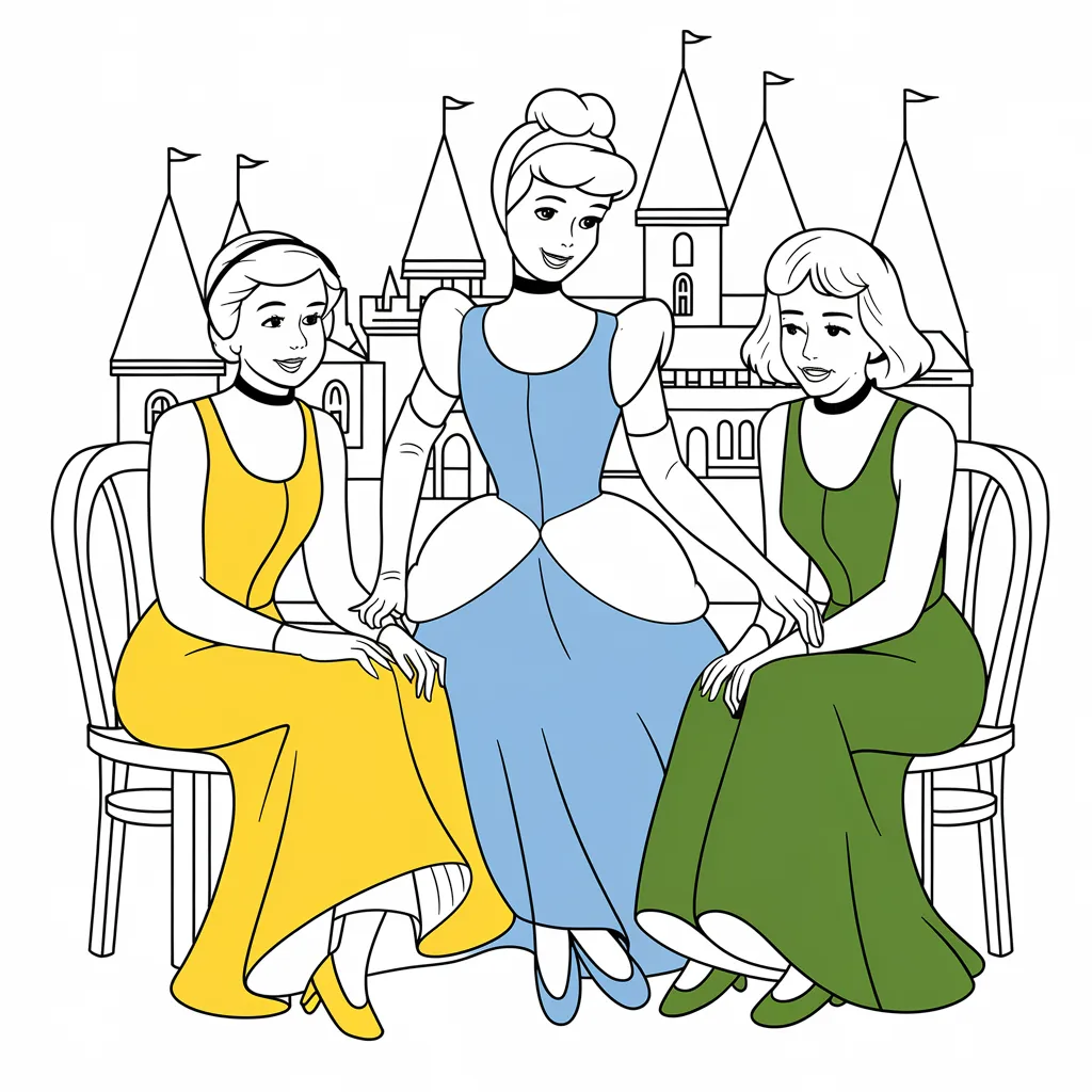 Gambar interaksi antara Cinderella dan kakak-kakak tirinya, mengajarkan tentang sikap baik meski diperlakukan tidak adil.
