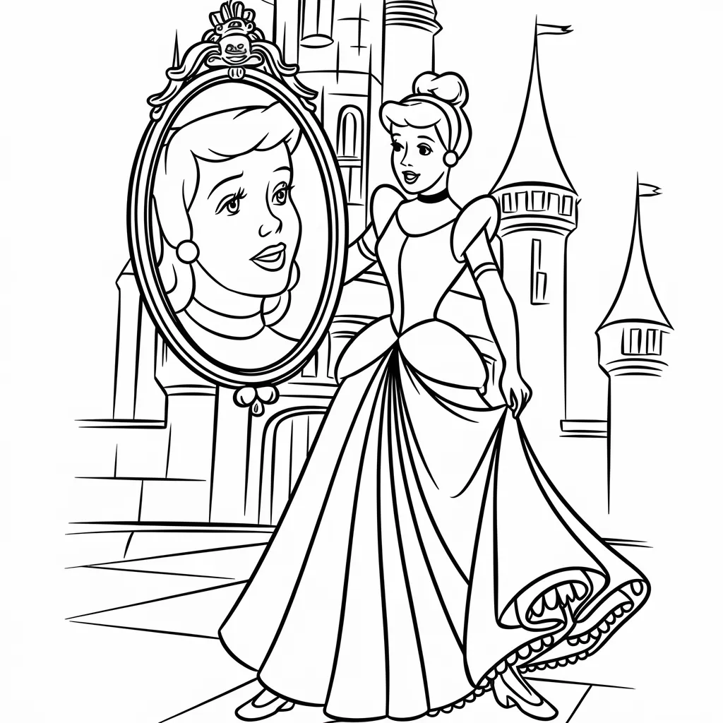 Gambar Cinderella yang bercermin sebelum pergi ke pesta, menambah elemen fantasi.