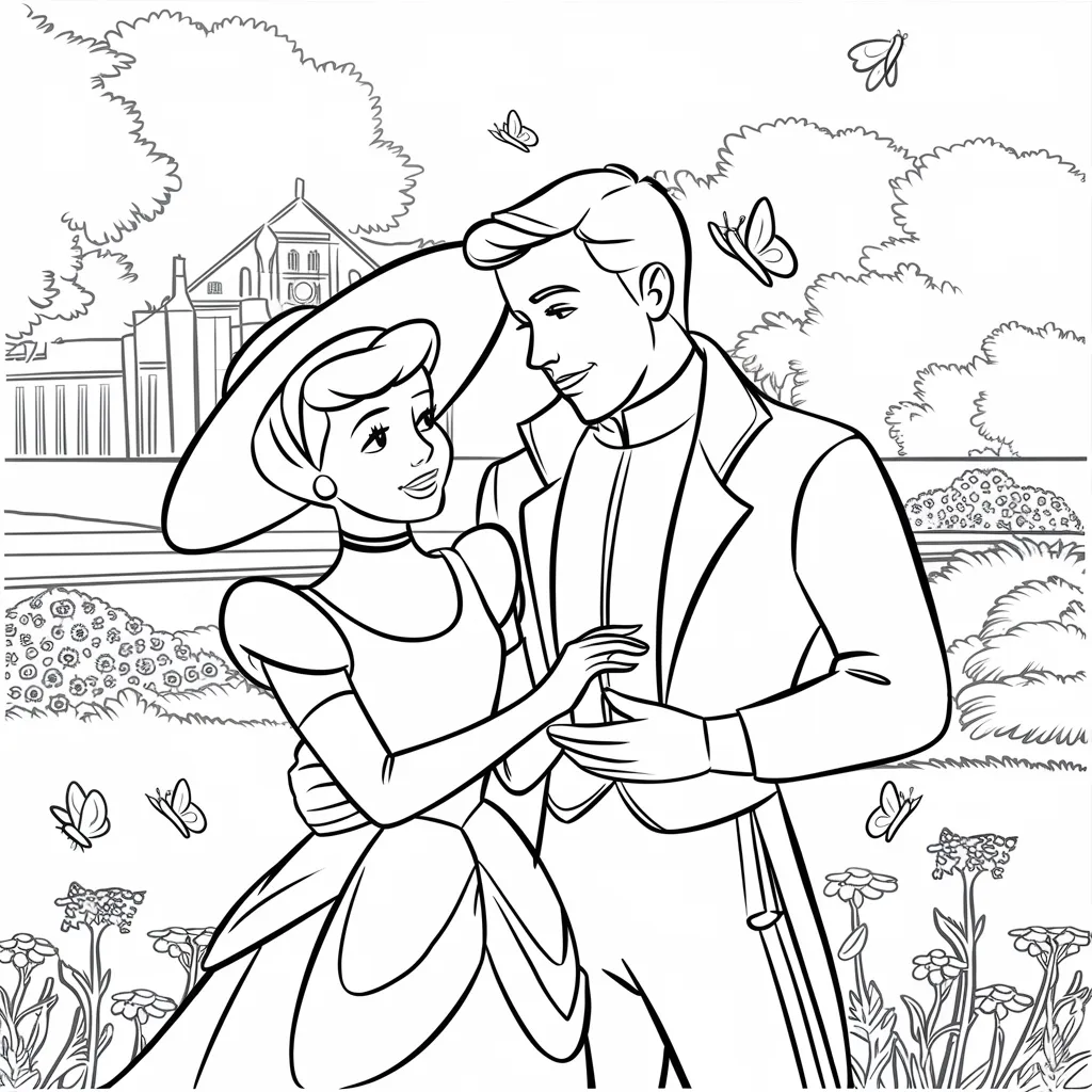 Gambar Cinderella dan pangeran berjalan-jalan di taman istana, menampilkan kebahagiaan dan cinta.