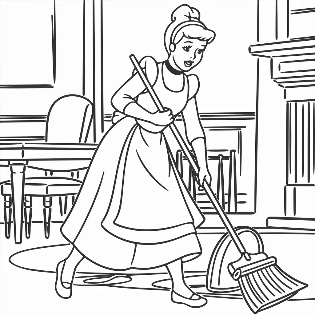 Ilustrasi Cinderella saat membersihkan rumah tiri, mengajarkan tentang kerja keras dan tanggung jawab.