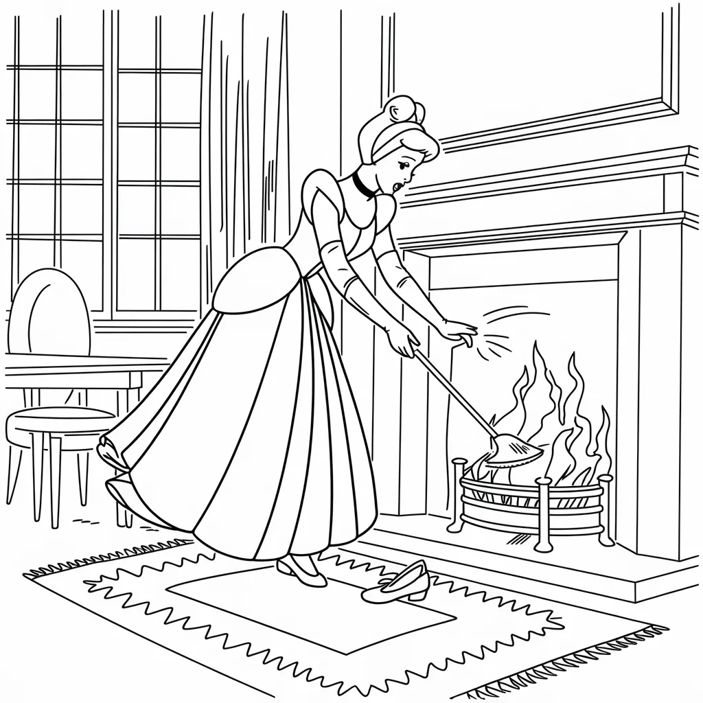 Ilustrasi Cinderella yang sedang membersihkan perapian, menunjukkan ketekunan dan kesabaran.