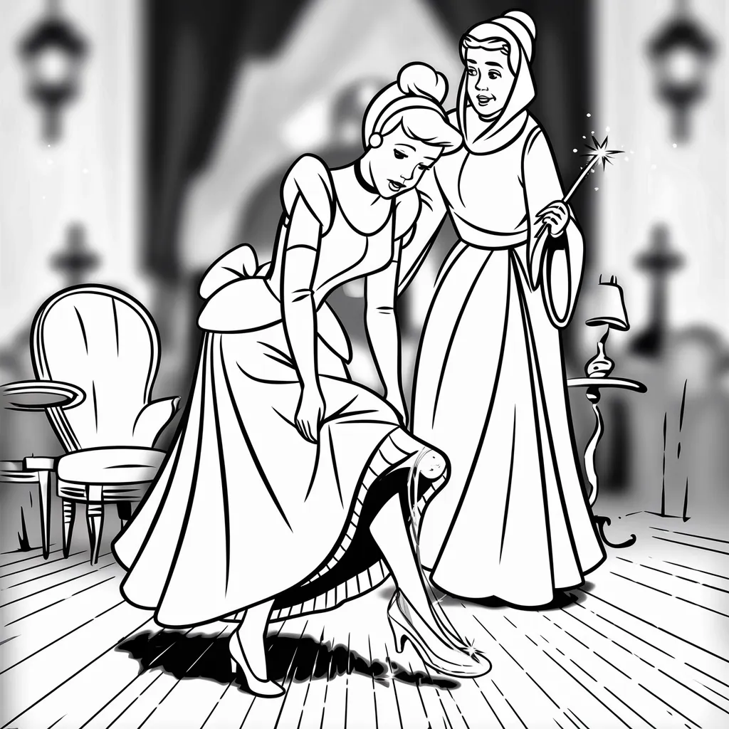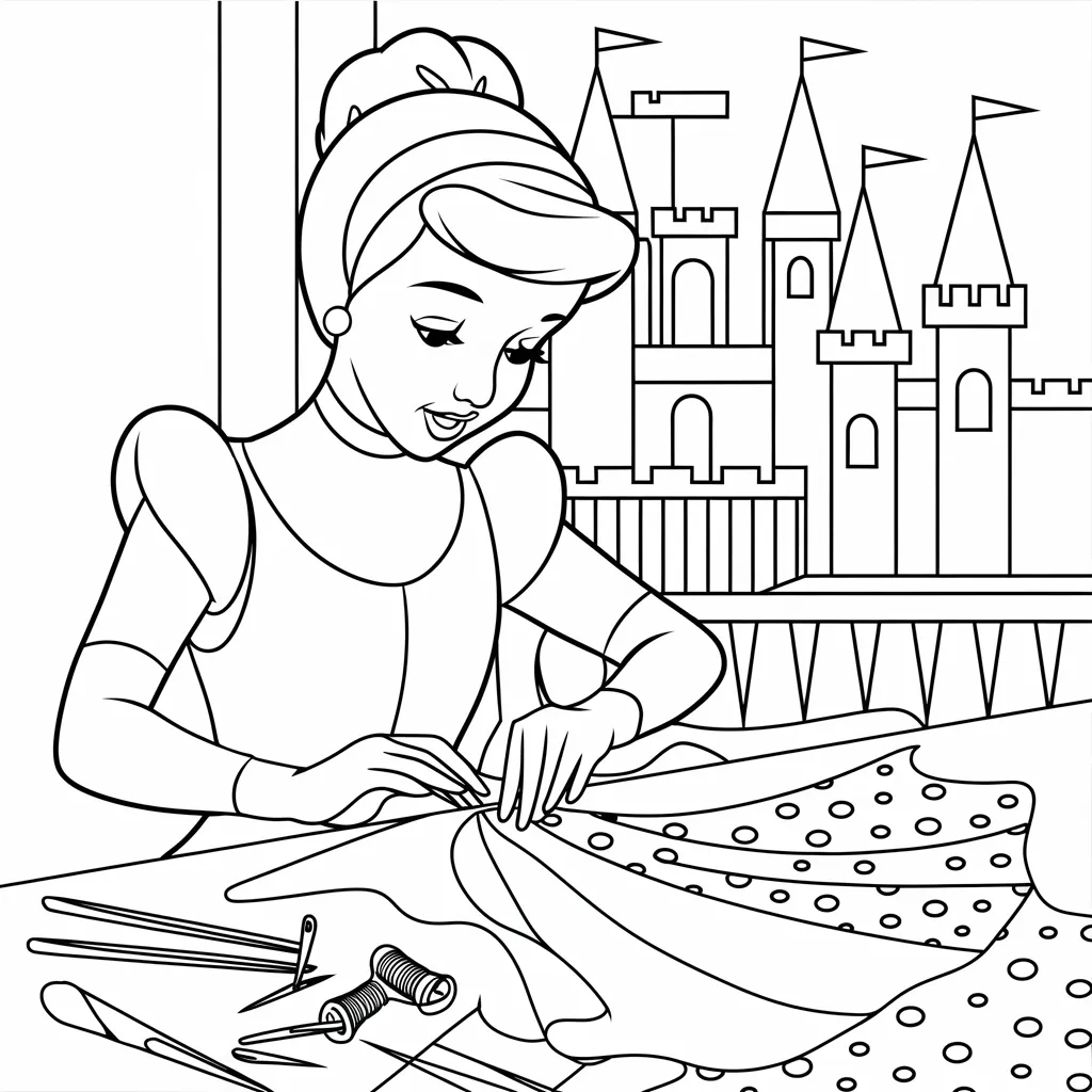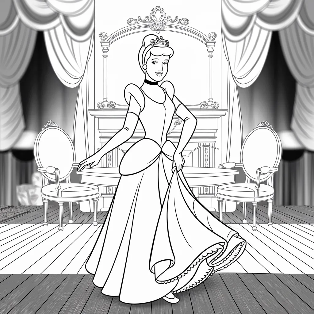 Gambar Cinderella mengenakan gaun pesta indah sebelum pergi ke bal utama, memungkinkan anak-anak untuk berkreasi dengan warna-warna glamor.