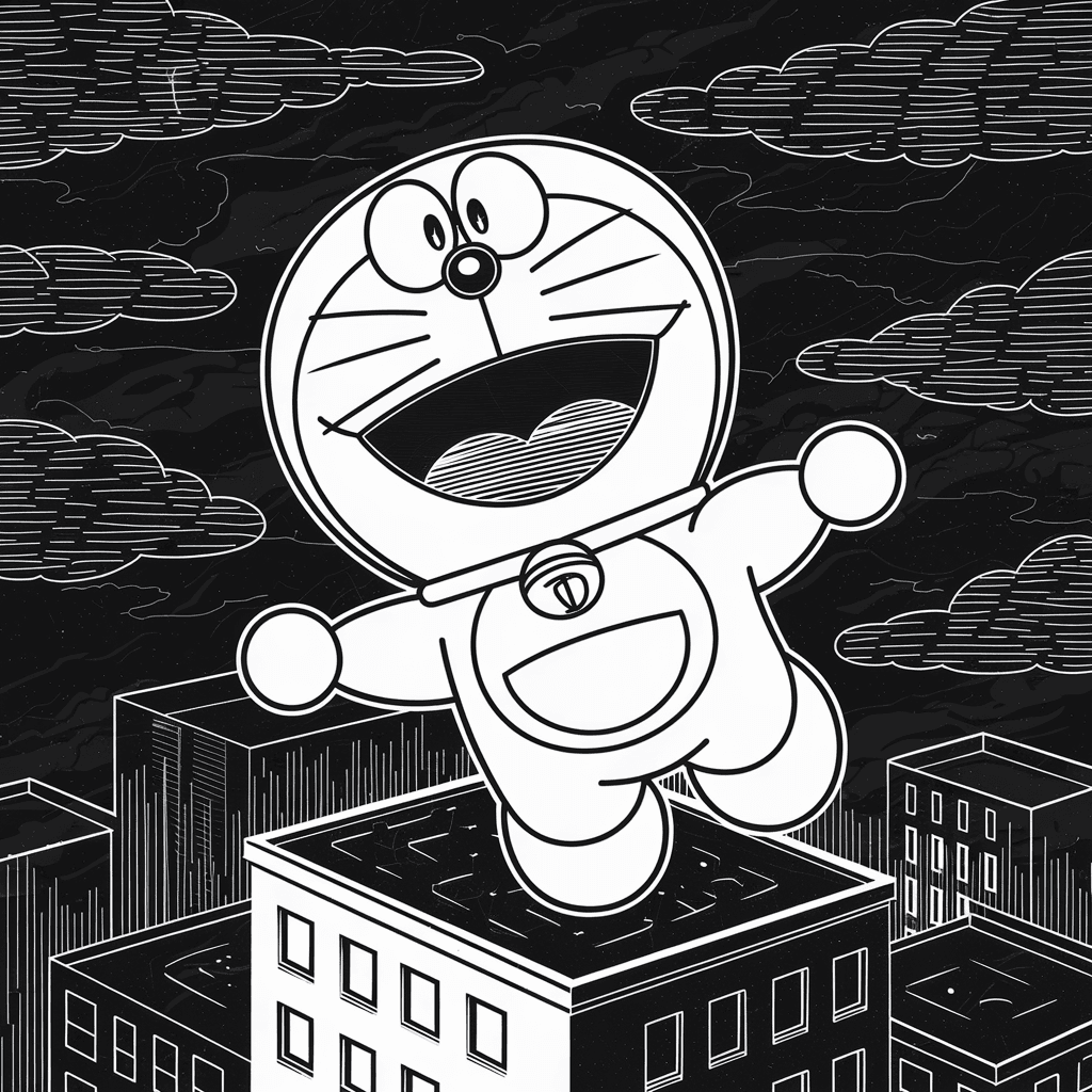 Ilustrasi Doraemon berdiri di bawah lampu neon, dengan latar belakang grafiti yang bersinar di malam hari.