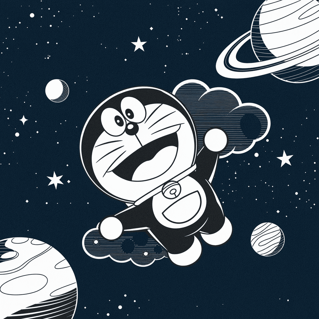 Gambar Doraemon di lingkungan luar angkasa dengan grafiti futuristik yang menggambarkan planet dan bintang.