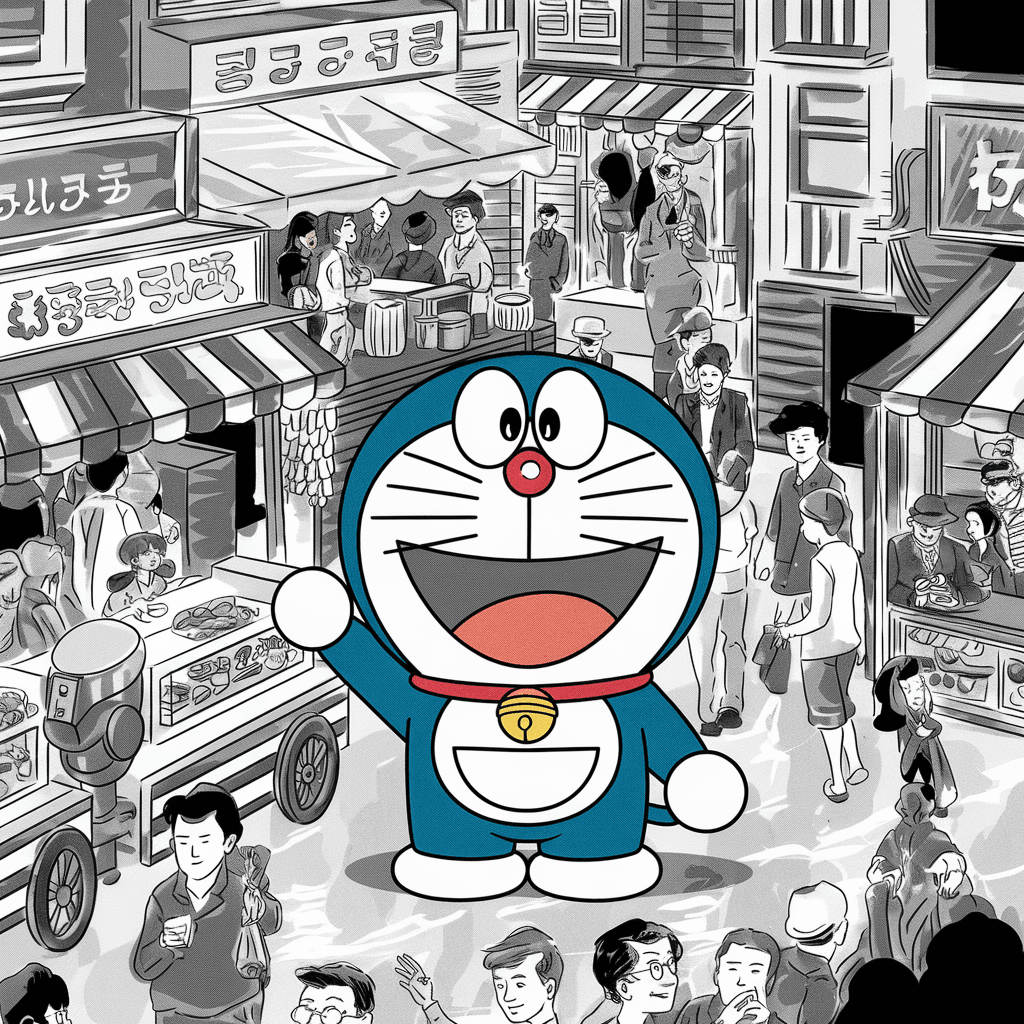 Ilustrasi Doraemon berjalan di jalanan berbatu dengan latar belakang grafiti yang terinspirasi dari budaya lokal.
