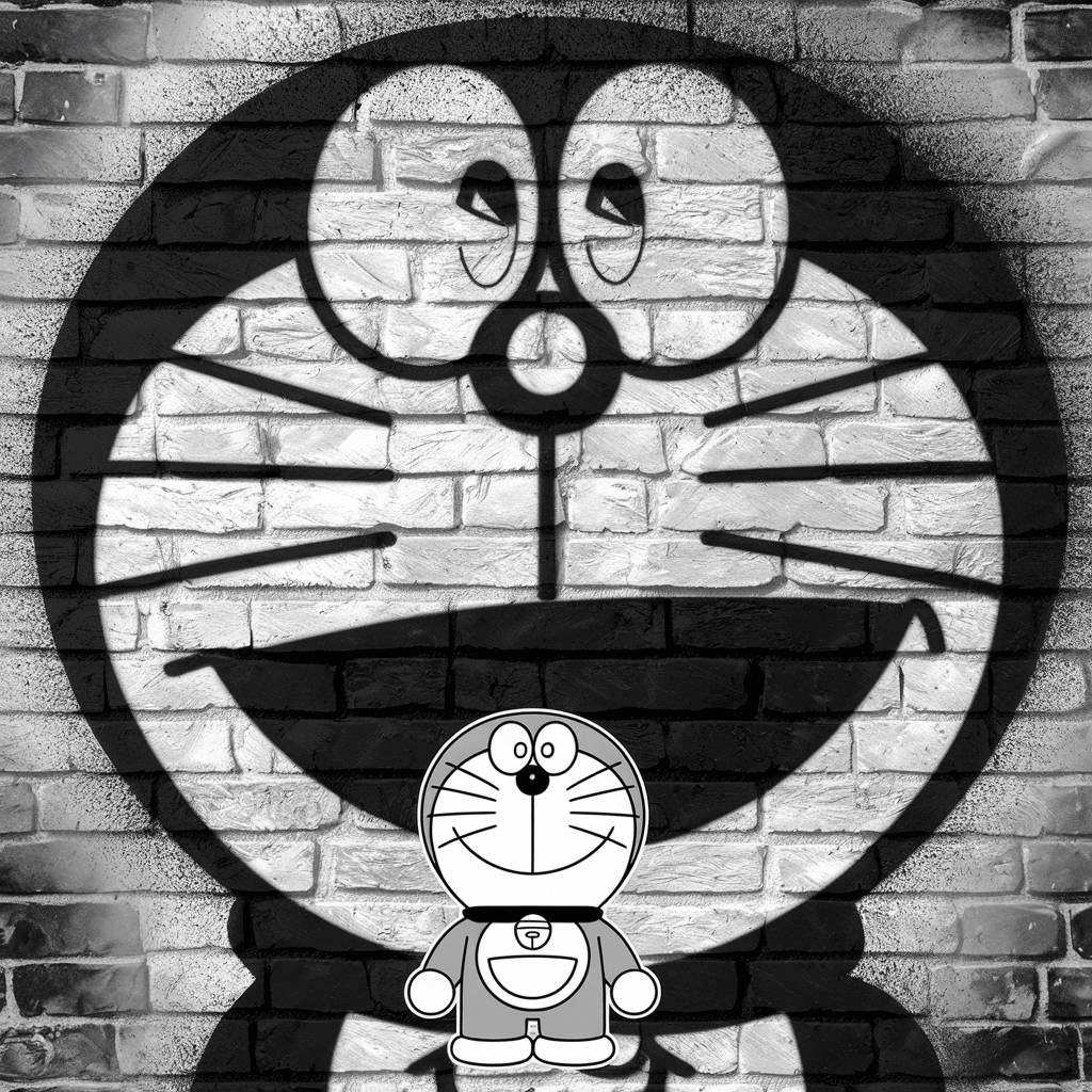 Gambar Doraemon menggunakan teknik stencil untuk menciptakan grafiti yang rapi dan terstruktur di dinding.