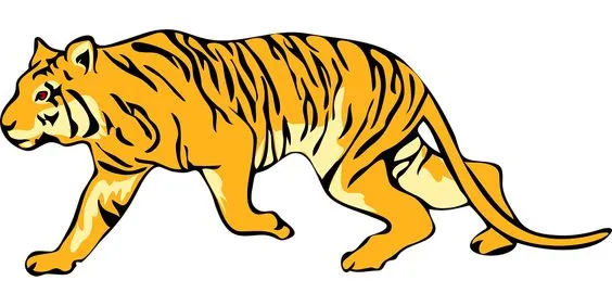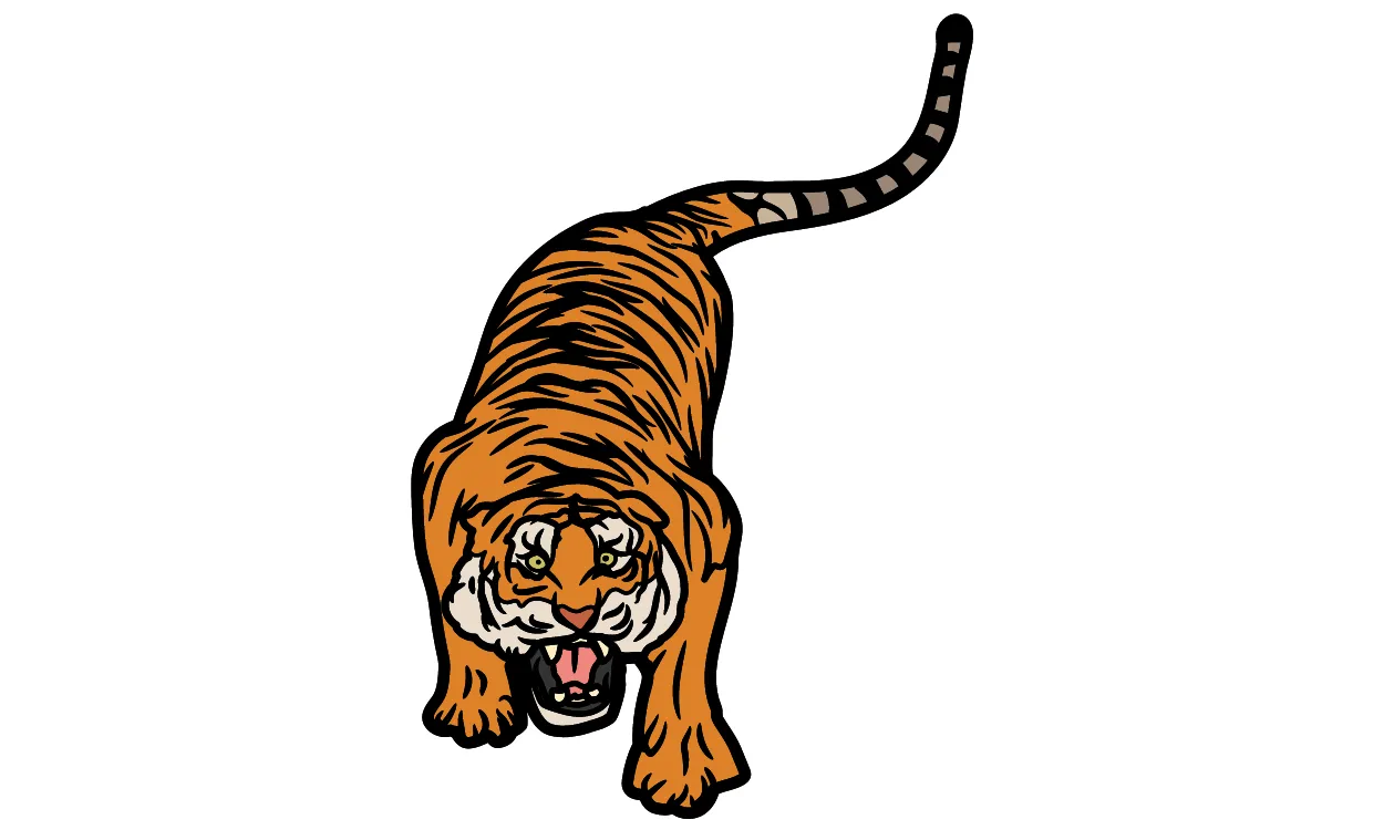 Harimau dewasa jantan biasanya berjalan dengan langkah yang mantap dan pasti. Gambar kartun dapat menampilkan gerakan yang tenang dan berkekuatan, dengan tubuh yang seimbang dan langkah yang terukur, menciptakan kesan keberanian dan dominasi.