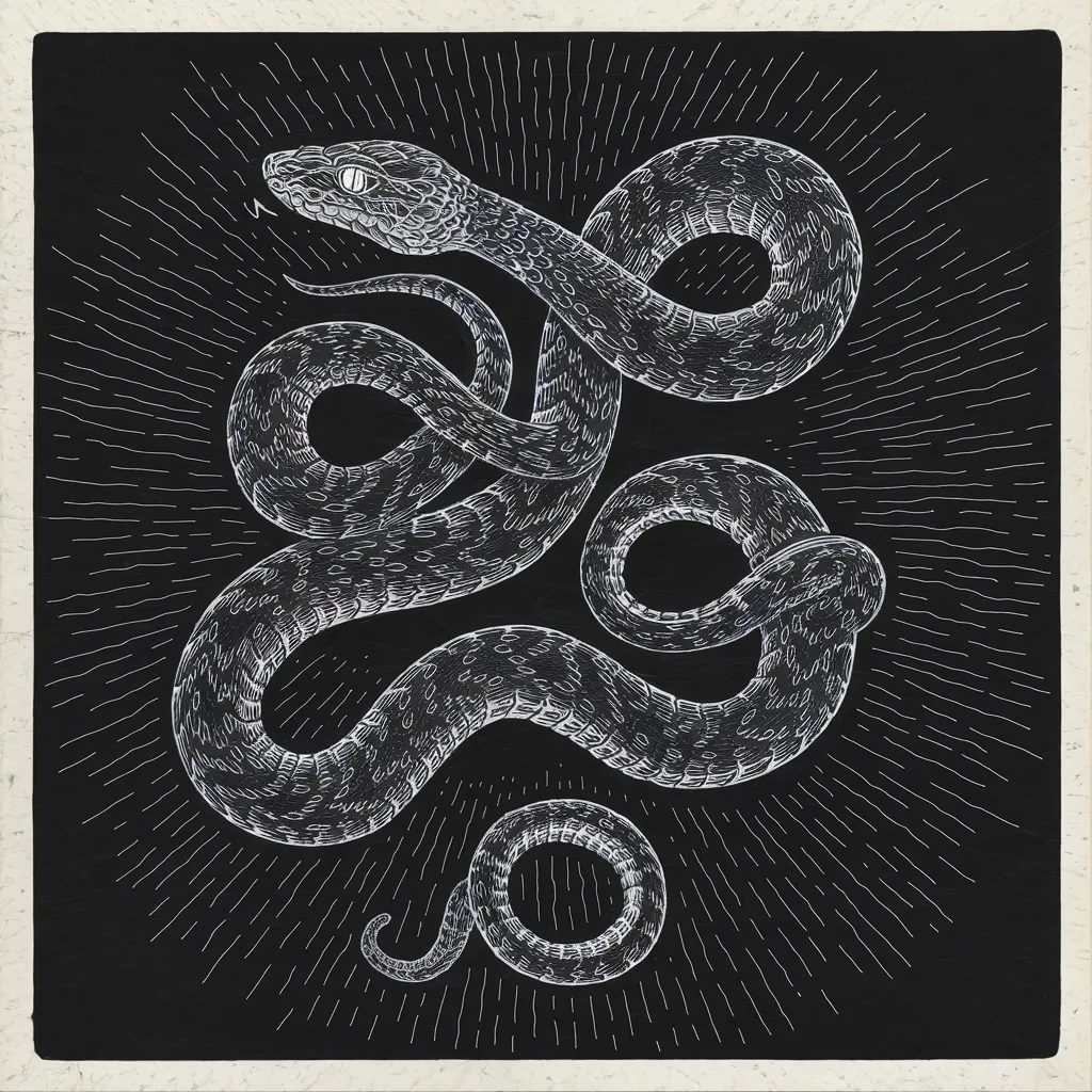 Gambar ular yang sedang melilit pohon dengan gerakan yang halus dan detail batang sisiknya yang menarik.