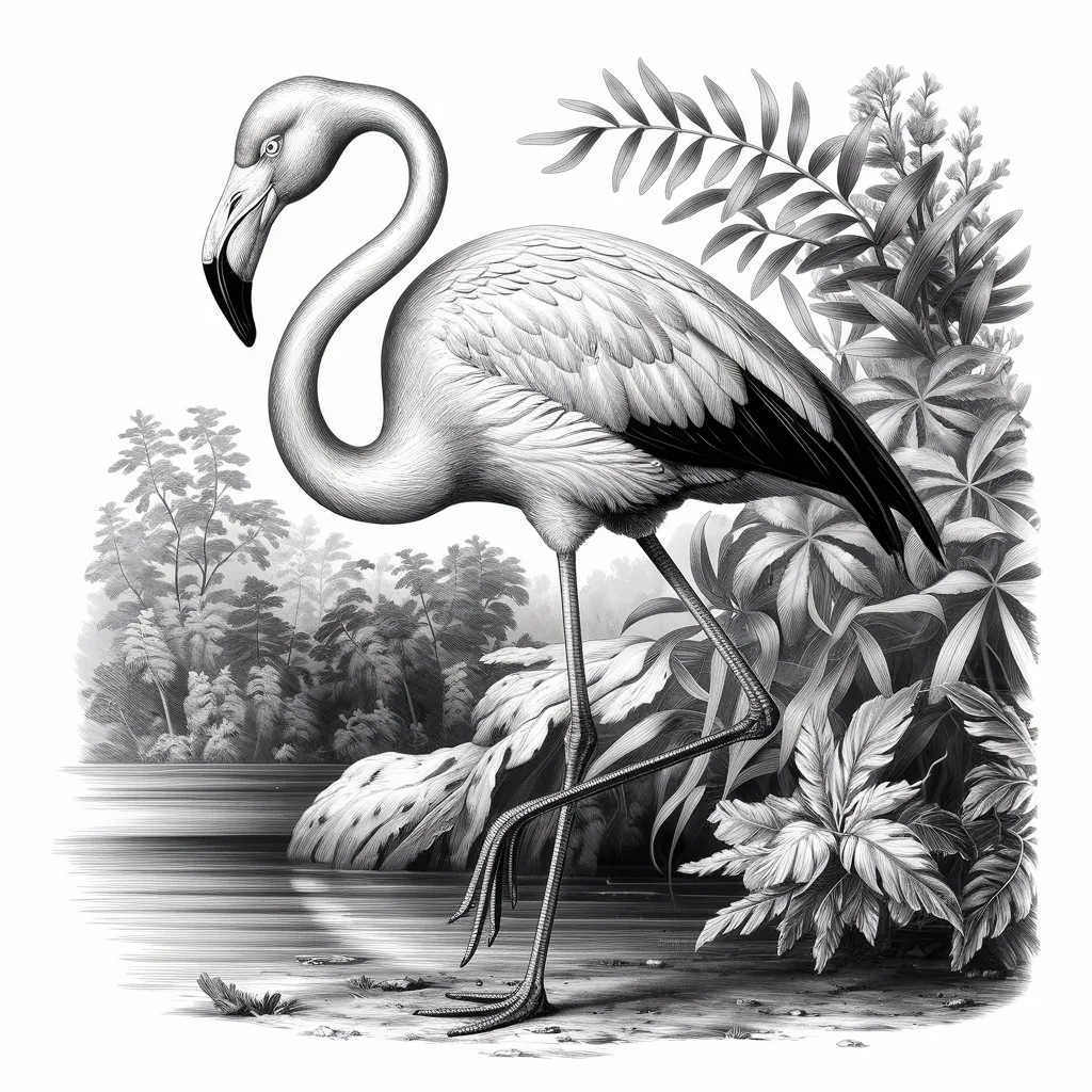 Ilustrasi burung flamingo yang berdiri di atas kaki satu di danau air tawar, menonjolkan keindahan warna dan bentuk tubuh.