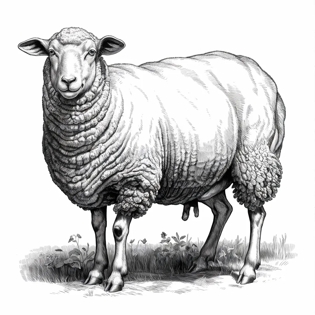 Ilustrasi domba yang sedang berjalan di padang rumput dengan latar belakang bunga-bunga pembohong.