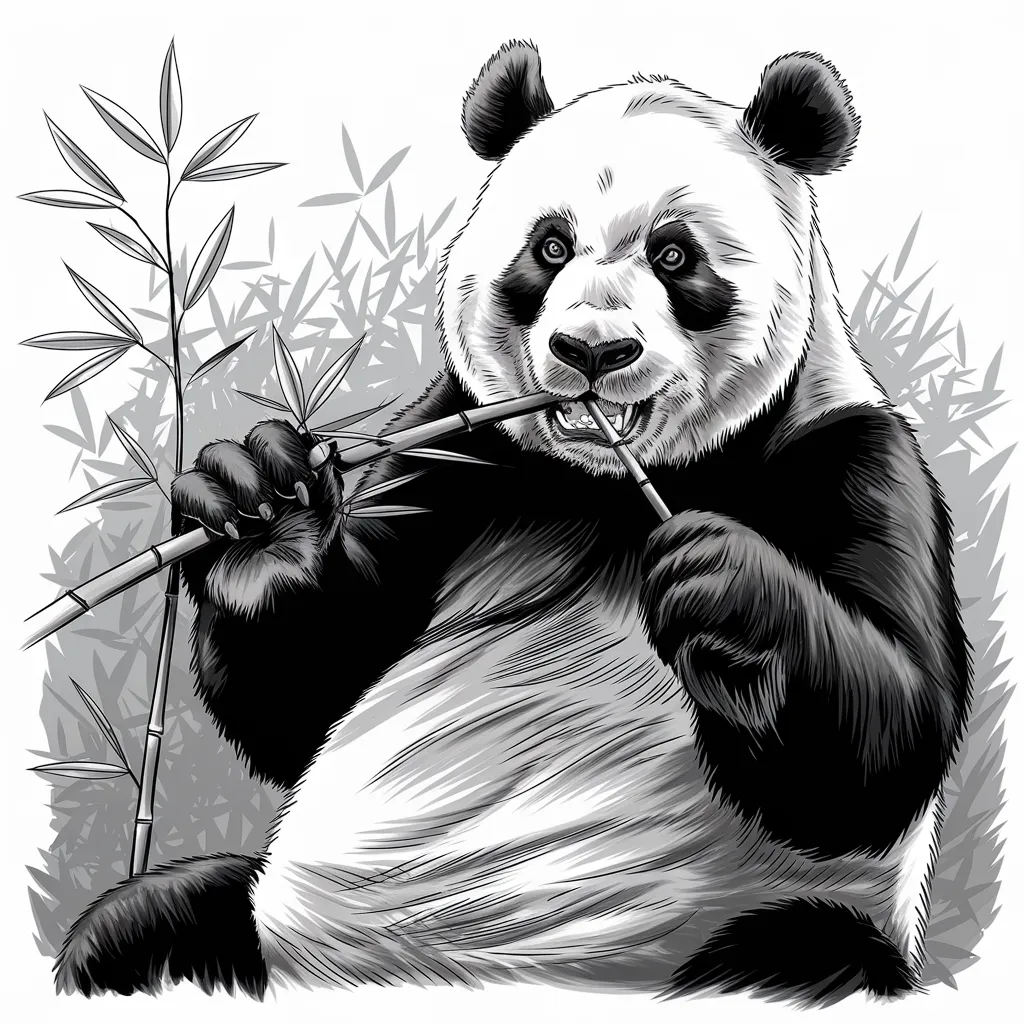 Ilustrasi panda yang sedang memegang dan makan batang bambu, menampilkan ekspresi wajah yang lucu dan imut.