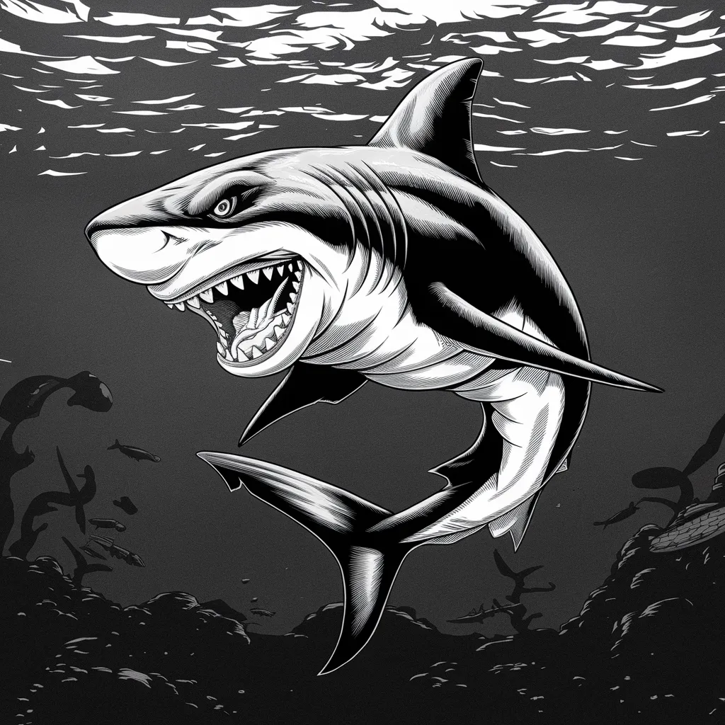 Gambar hiu dengan postur tubuh yang agresif dan gigi tajam, menonjolkan kekuatan dan kecepatan.