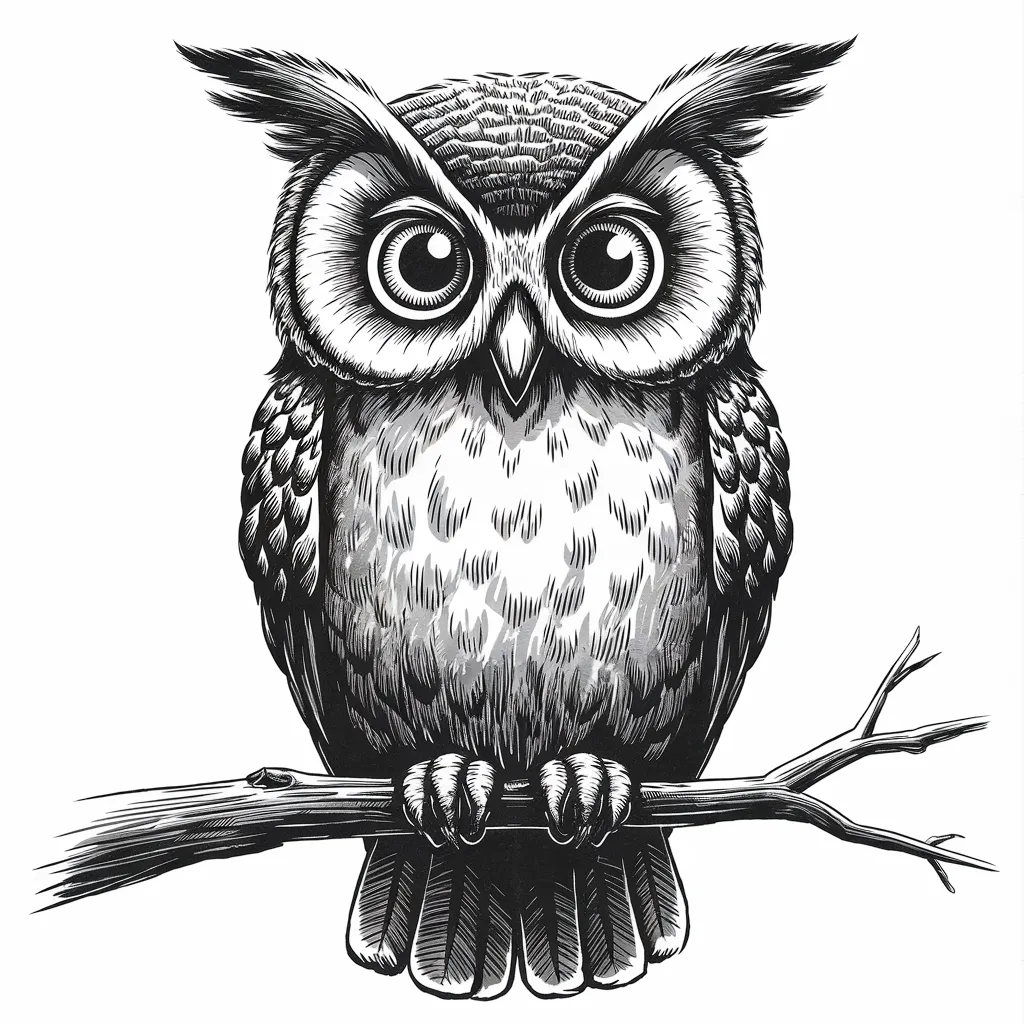 Gambar burung hantu yang duduk di cabang pohon dengan mata besar dan ekspresif, memberikan kesan misterius.