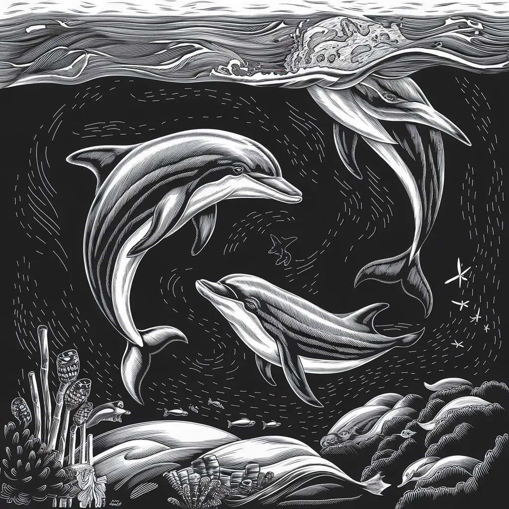 Ilustrasi lumba-lumba yang sedang melompat dan menari di atas ombak, menimbulkan kesan gembira dan kelincahan.