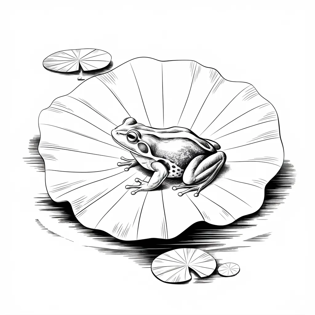 Gambar katak yang duduk di atas daun teratai di kolam, menciptakan suasana tenang dan alami.