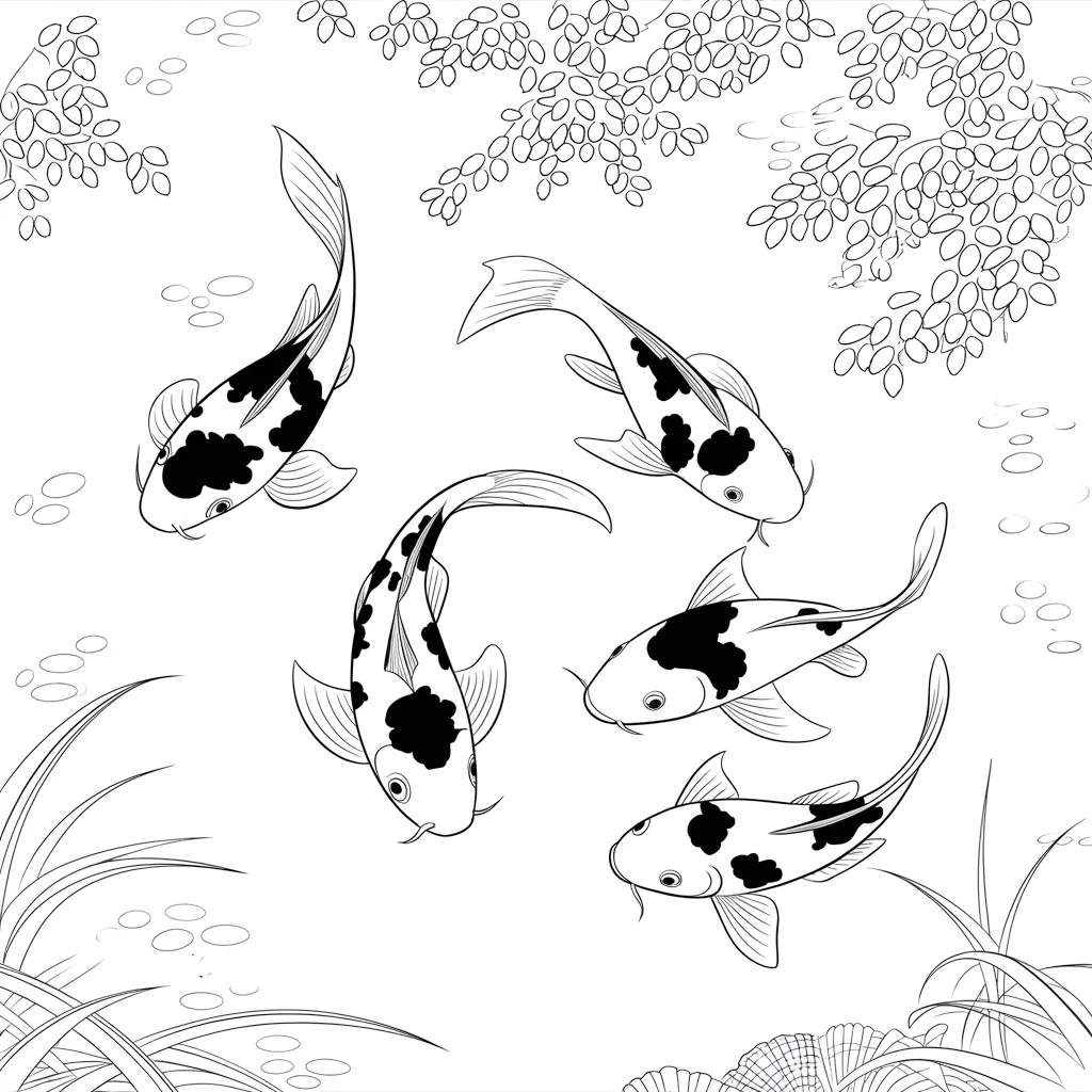 Ilustrasi ikan koi yang berenang di kolam Jepang dengan bunga teratai dan pepohonan sakura di sekitarnya.