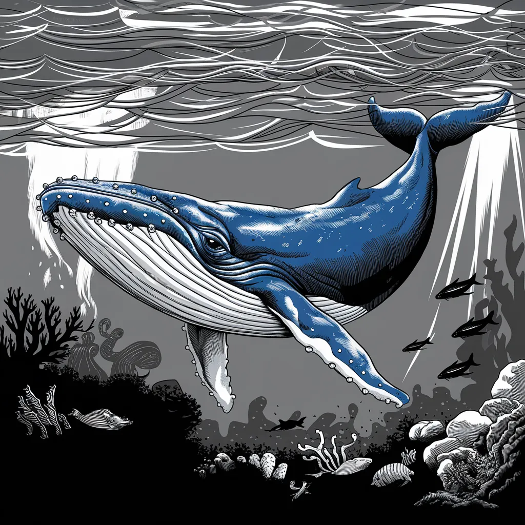 Ilustrasi jeda biru yang besar sedang berenang di lautan dengan riak air yang menggambarkan kedalaman.
