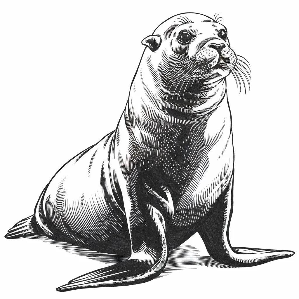 Ilustrasi singa laut yang sedang berjemur di pantai dengan latar belakang laut dan pasir putih.
