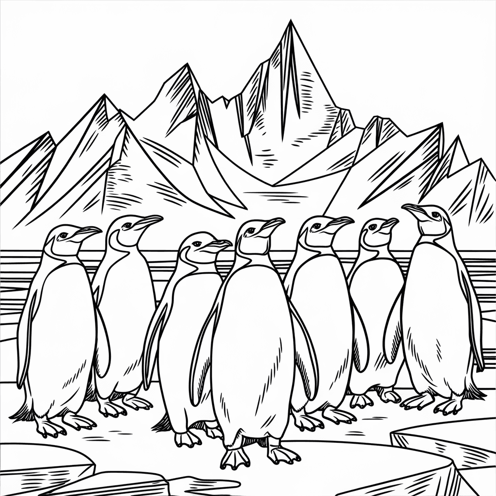 Sekelompok penguin berdiri di atas es, dengan latar belakang pegunungan es.