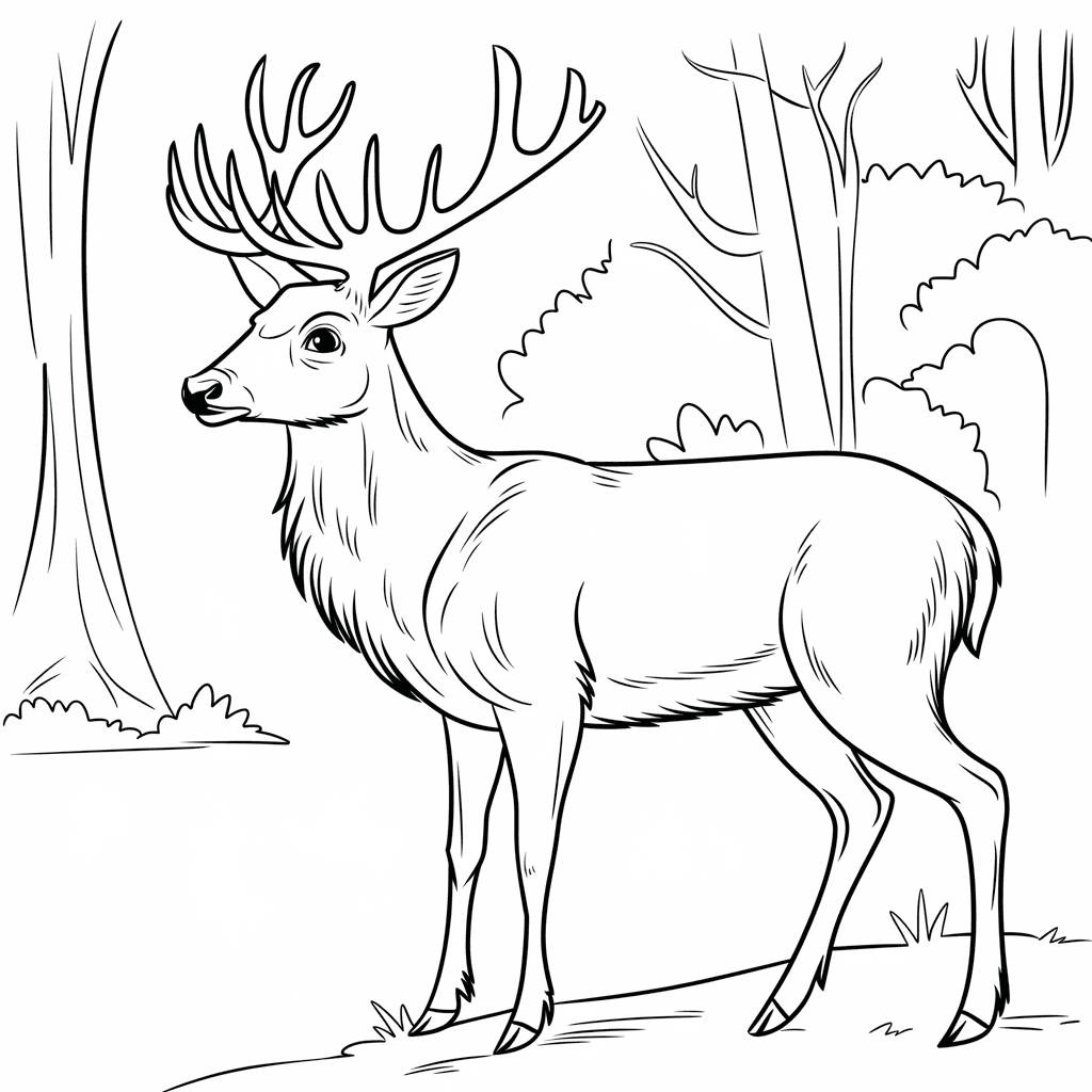 Rusa jantan dengan tanduk bercabang, berdiri di tepi hutan.