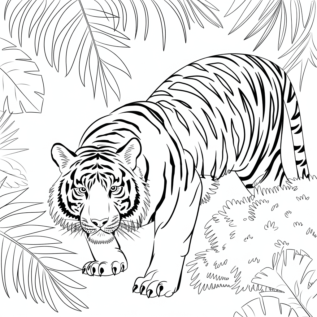 Harimau dengan pola garis yang khas, bersembunyi di balik semak-semak hutan tropis.