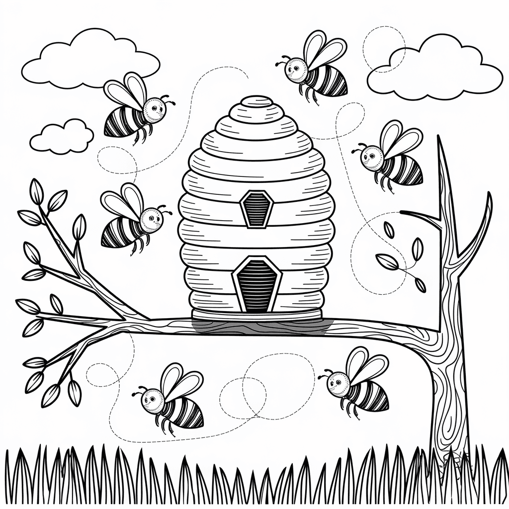 Lebah terbang di sekitar sarangnya, mencari bunga.