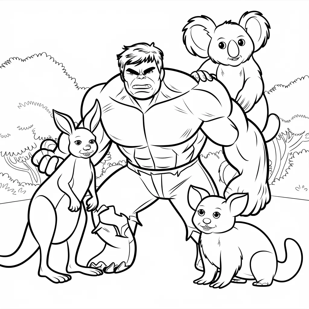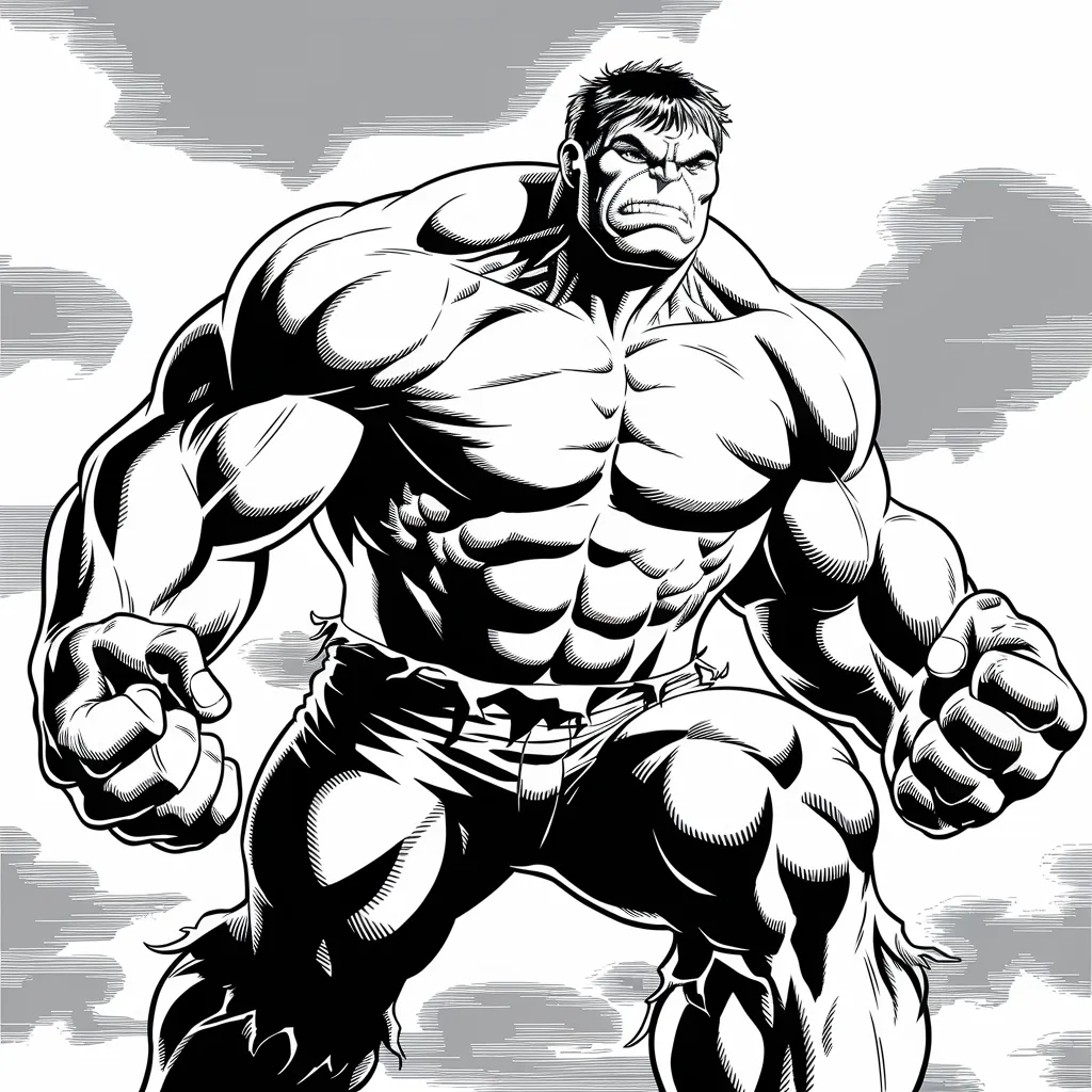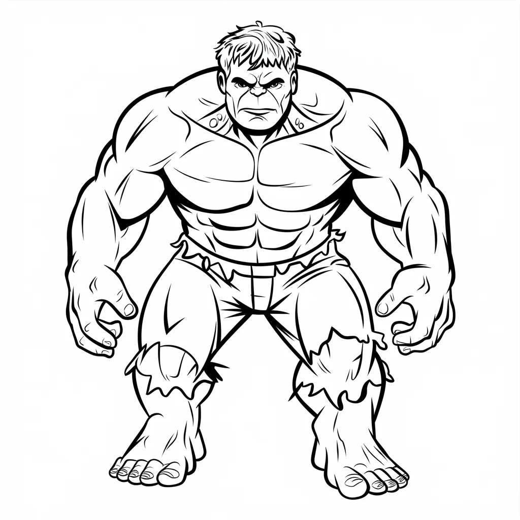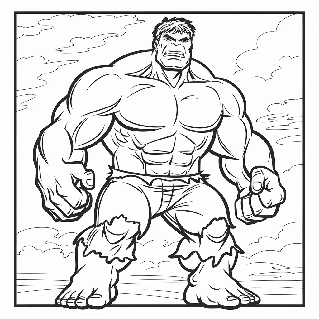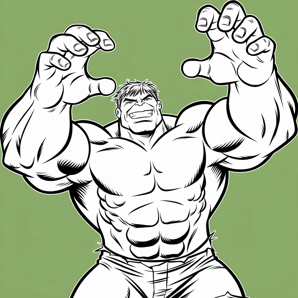 Gambar Hulk yang menunjukkan otot-ototnya dengan pose siap bertarung, memungkinkan anak-anak untuk mewarnai detail otot dan ekspresi wajah yang kuat.